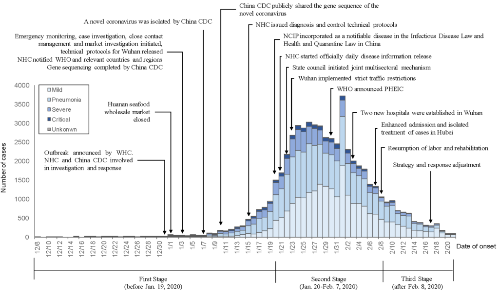 The outbreak was first announced on 30 December and the new coronavirus was isolated on 7 January and its gene sequence publicly shared on 10 January. The number of new cases per day peaked at around 3,000 just over two weeks later on 26 January but had fallen to fewer than 500 cases daily by 14 February.