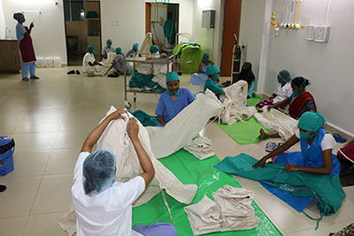 Usamos todos os recursos para preparar o EPI. Não havia nenhum que pudesse ser comprado localmente. Apesar de todas essas dificuldades, a equipe foi estóica [2] e cooperou de coração. Pegamos dinheiro emprestado e compramos qualquer material que pudéssemos conseguir nas lojas locais. Em seguida, projetamos nosso próprio EPI – equipamento de proteção costurado à mão – com todos contribuindo. Compramos pó de descoloração, preparamos uma solução de hipoclorito e coletamos álcool industrial para higienizadores de mãos. Tudo o que julgamos necessário para tratar os pacientes com COVID-19, improvisamos. Fizemos nossas próprias máscaras de tecido de quatro camadas e convertemos folhas de plástico em aventais e galochas em calçados de proteção.